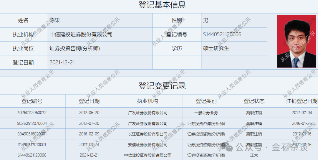 陈果,复旦大学理学学士,上海交通大学金融硕士,凭据券交易协会信息,陈果是卖方老东说念主,2012年就加入了卖方,先后赴任于广发证券、长江证券、安信证券以及中信建投证券。
