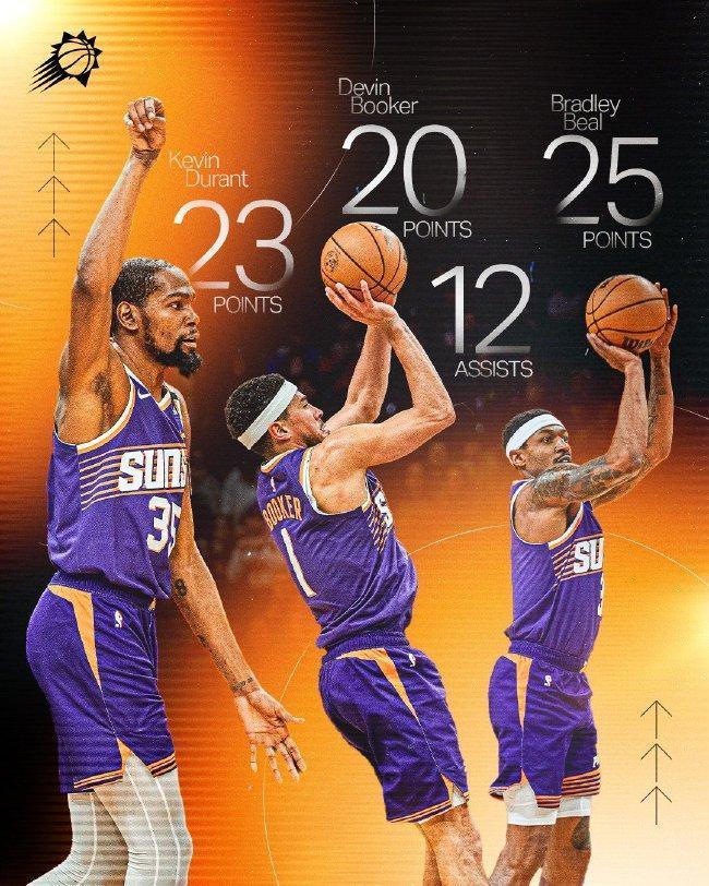 比尔替补出战16投11中孝顺25分7篮板,阿伦替补出战三分6中5孝顺23分。太阳4东说念主20+力克敌手,17胜19负延续名次西部第十二。